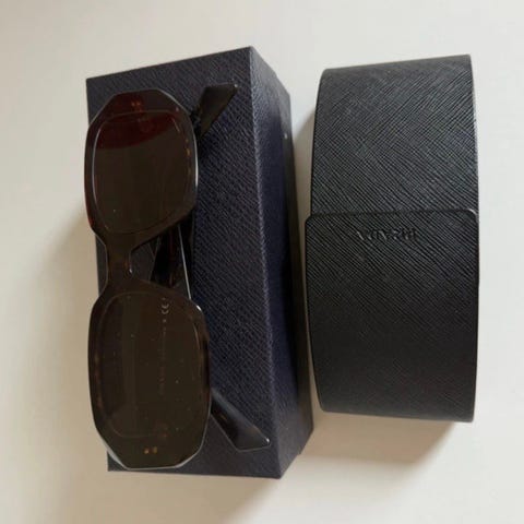 Prada OPR 17WS solbriller til kvinde i sort. Modellen har kraftig, rektangulær stelform med Prada-logo på stængerne. Solbrillerne har mørke glas. Leveres med original æske, pose, kvittering og opbevaringspose, som vist på billederne.