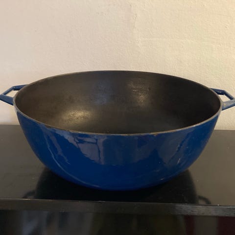 Stor stegegryde i blå emaljeret støbejern m glaslåg mærke Nacco s6 made in Denmark ( retro) super velholdt bund dia cm 23,5,top dia cm 37,5,højde cm og 14,7, total højde incl låg cm 22,3