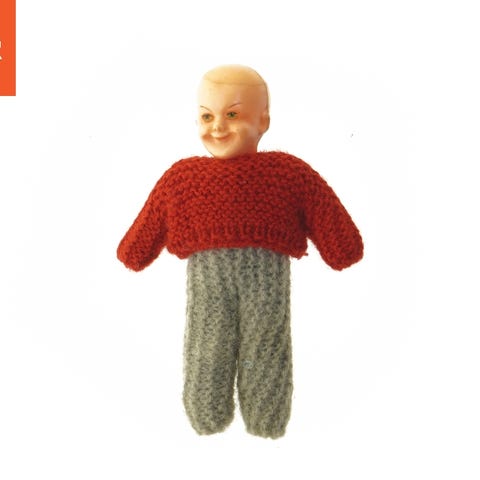 En vintage dukke på 30 cm iført stribet tøj. Dukken har håndlavet udseende med detaljeret påklædning. Den står fast på trælignende fodplader og har stofarme og -ben. Dukken har stribet bukser med ensfarvet overdel, samt robust hår. Materialet ser ud til at være kombineret tekstil og træ.