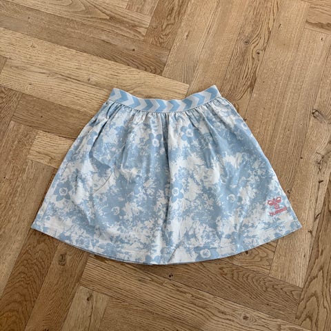 En børnenederdel i navy farve med et skørt design. Nederdelen har et elastisk taljebånd med guldskrift, hvor 'hummel' er gentaget.