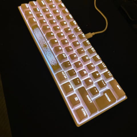 'Folinec kablet tastatur med RGB-belysning i sort. Standard fuld størrelse layout med numerisk tastatur og medietaster i toppen. Tilsluttes via USB-kabel, som ses på billederne. Baggrundsbelysning i flere farver hen over tasterne. Velegnet til brug med stationær eller bærbar computer, hvor der ønskes et kablet tastatur med lys i tasterur'