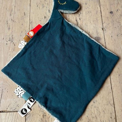 Denne nusseklud er formet som en giraf og lavet af blødt plys. Forsiden er primært lysebrun, mens bagsiden er mørkebrun med diverse farvede mærker og mønstre på kanterne. Kluden har en størrelse på 26x27 cm og er ideel til små børn som en tryghedsklud eller krammeven. Kluden har broderet øjne på giraffens hoved, hvilket giver den et sødt og sovende udtryk. Mærket 'done by deer' kan ses på kluden.