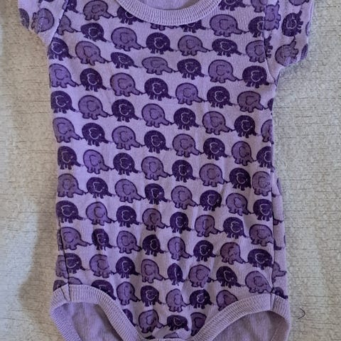 Bodystocking til børn med kortærmet design. Den har et mønster med elefanter i brune og grønne farver på en hvid baggrund. Velegnet som undertøj eller som en enkel beklædningsgenstand til små børn.