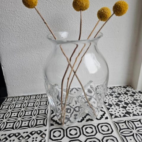 Denne vase er lavet af klart glas og har en konisk form med en højde på 34 cm. Den har et metallåg og kan bruges til dekoration eller til at holde friske eller tørrede blomster. På bunden af vasen er der indgraveret ordet 'Willis'.