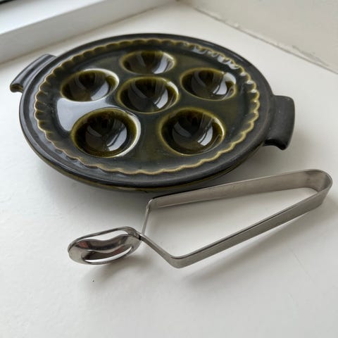 Lille sød tallerken. Egentligt egnet til snegle, men tænker også den kan bruges til anretning af tapenade, pesto eller nødder til en omgang tapas.