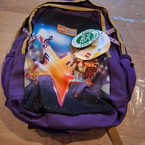 Rygsæk markedsført under LEGO Friends-mærket. Rygsækken har et farverigt design med sommerfugle, stjerner og hjerter på fronten. Den har en stor lynlåslomme foran og to justerbare skulderremme bagpå, i en kombination af lyseblå og lilla farver. Dimensionerne på rygsækken er 35x29 cm.