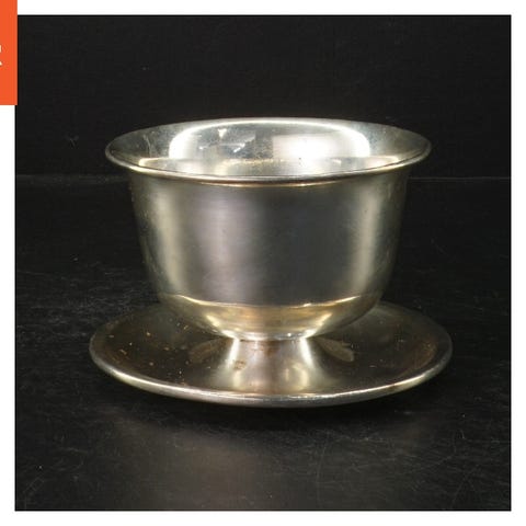 Sovseskål med tilhørende underfad i porcelæn, dekoreret med blomstermotiver og guldkant. Skålen har et elegant bølgemønster og et dekorativt håndtag på siden. Underfadet følger samme stil og har også blomstermotiver og guldkant.