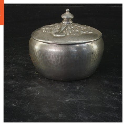 Dekorativ rund metalbeholder (str. Ø. 14,5 cm. længde. 9 cm)
