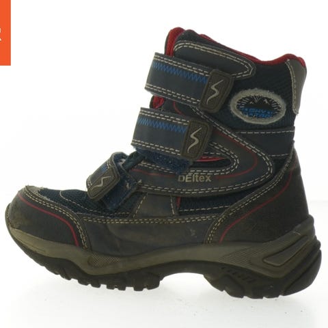 Par børnestøvler i størrelse 25, designet med flere velcrolukninger for nemt at tage på og af. Støvlerne har en mørkeblå farve med lyseblå interiør og en robust gummisål, som sikrer optimal greb. De er vandtætte, hvilket gør dem velegnede til vådt vejr. Indvendigt har de isolering for ekstra komfort og varme. Syningerne langs overfladen giver et stilfuldt udseende. Støvlerne er ideelle til aktiv udendørs leg.