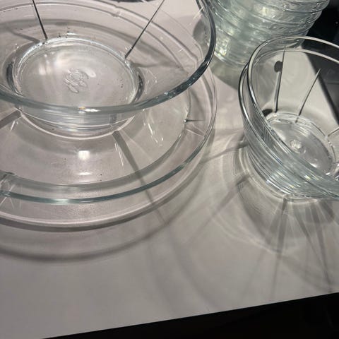 Sæt af fire runde glas skåle. Hver skål har en diameter på 15,5 cm. Skålene er gennemsigtige og kan bruges til servering eller opbevaring af forskellige fødevarer. De er nemme at rengøre og kan stables for nem opbevaring. Tags: skåle, glas, køkken.