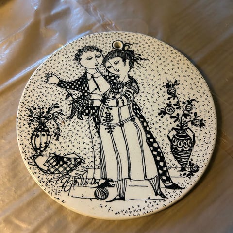 En rund keramisk vægplakette med en diameter på 15,5 cm. Plaketten har et detaljeret sort-hvidt design på forsiden, som forestiller to figurer klædt i blomstret og ternet tøj, der skaber en maske-lignende illusion. Bagsiden har teksten 'Februar MASKERADE Nyholm Danmark' samt informationen 'Holbæk Amts Sygehus 1972'. Der er et hul øverst til ophængning.