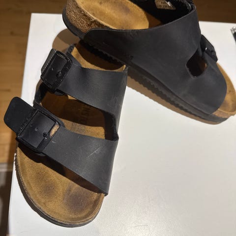 Arizona ruskind, sorte sandaler med to remme og justerbare spænder. Sandalerne har en brun korksål og en formet fodseng for komfort. Størrelsen på sandalerne er 42. Sandsynligvis lavet af ruskindsmateriale. De er velegnede til afslappet brug og kan kombineres med forskellige outfits. Tags: sko, sandaler, ruskind, remme, sort.