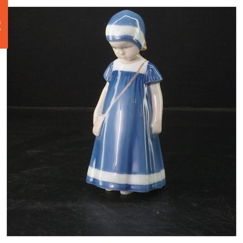 Figur formet som et knælende barn, fremstillet i keramik. Figuren har en glaseret overflade, med detaljerede udskæringer der viser barnets tøj og sko. Den er primært blå og hvid, med realistiske nuancer på hud og hår. Den vejer omkring 9x10 cm, og bunden viser en inskription - 1564/F, muligvis relateret til dens model eller serie.