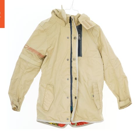 Jakken er en oliven grøn børne vinterjakke med lysegrønne syninger og riflet kant omkring ærmer og talje. Den har flere lommer foran med velcrolukning og emblemer på ærmet. Kraven er høj og kan lukkes med trykknapper.
