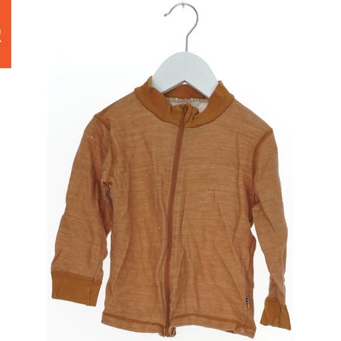 Langærmet bluse i orange farve, designet til børn. Blusen har en rund halsudskæring og rib ved håndleddene. Der er en lille mærkeetiket på nederste kant med farverige striber.