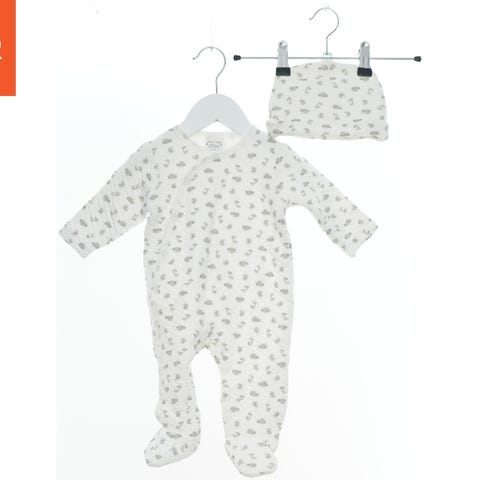 Dette er en heldragt til babyer, hovedsageligt i hvid farve. Dragten har ben og ærmer, men uden fod eller hænder. Der er trykknapper langs fronten til at fastgøre dragten og en lille, broderet bamsemotiv på forsiden. Materialet har en let struktureret overflade.