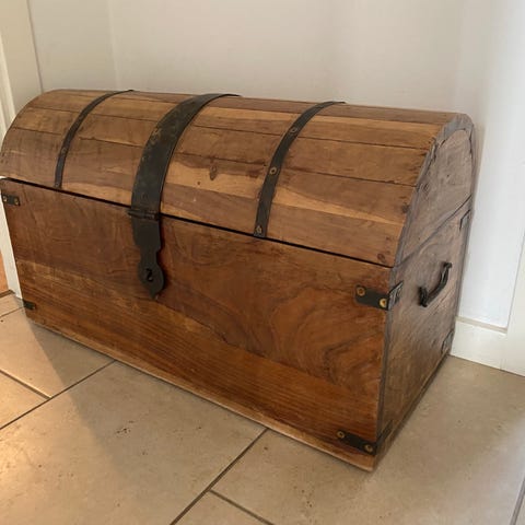 Malet træskrin i buet kisteform. Skrinet er udført i træ og er bemalet i grøn og rød med blomsterdekoration og årstal på fronten. Der er metalhåndtag i siderne til at løfte skrinet. Velegnet som opbevaringskiste eller dekoration i boligindretning.