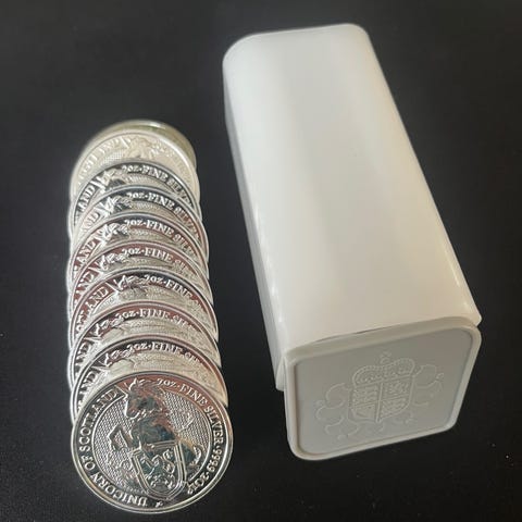 Her sælges 10 stk. 2 oz sølvmønter af varianten Queen's Beast Unicorn of Scotland (2018). En formidabel smuk sølvmønt i højeste kvalitet fra The Royal Mint.