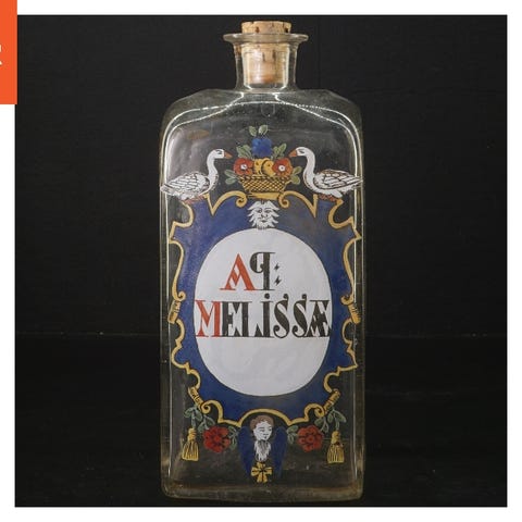 Denne genstand er en gammel apotekerflaske i brunt glas med en kork lavet af glas og et træhåndtag. Flasken har en firkantet bund og afrundet skuldre, der fører op til en smal hals, og er afsluttet med en glaskork, der er sikret med en metal kæde. Glasstrukturen virker tyk og robust.