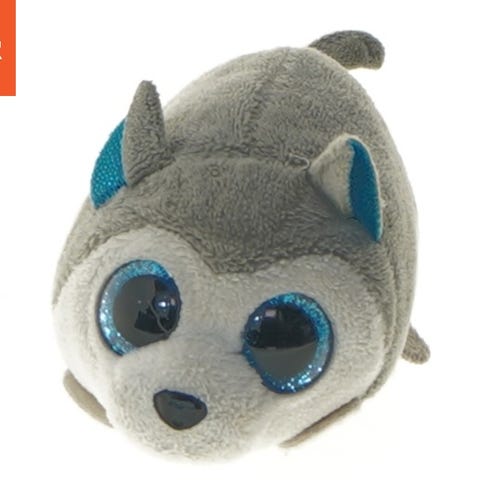 Plys fuglefigur med farverne blå og gul. Figuren har en rød detalje på toppen af hovedet og en lille sugekop fastgjort til toppen. Fremstillet i blødt stof og er 23,5 cm høj.