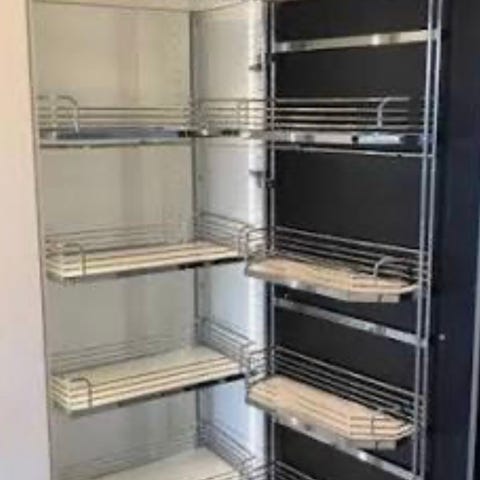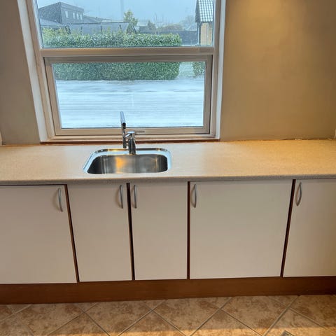 Højskab / skænk med glatte hvide fronter og træbordplade. Skabet har flere låger med skjulte greb og en lang, sammenhængende bordplade i træ, der kan bruges som afsætnings- eller arbejdsplads. Egnet til opbevaring i køkken, stue eller spisestue, f.eks. til service, køkkenmaskiner eller andre husholdningsgenstande.
