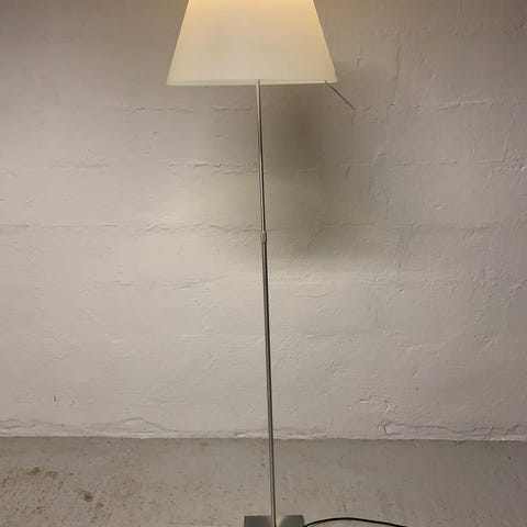 Gulvlampe i olieret eg og med sandfarvet stof.