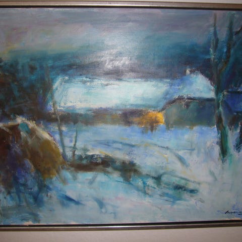 Fint oliemaleri på lærred, af Ingemann Jørgensen i perfekt stand, blå og grønlige nuancer, maleriet har titel: "Sommermåne i klitten", maleriet er malet i 1974 og måler: 88 x 68, Fra ikke ryger hjem. maleriet er uden ramme