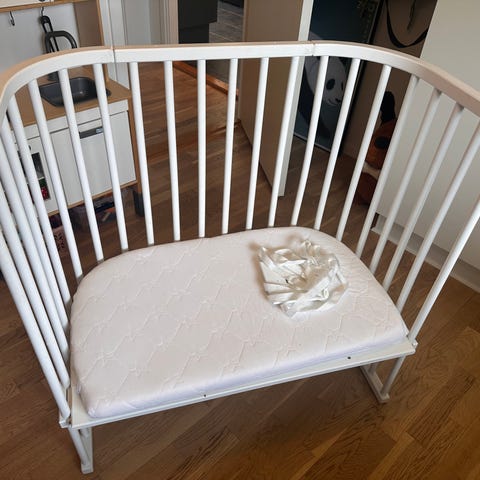Sælger vores Babybay bedside crib i størrelse XXL (høj, ekstra bred og lang). Nypris: 2.299 kr. Der medfølger også sengerand i farven creme, nypris 399 kr. Begge dele er købt sommeren 2025 hos My Copenhagen Kid.