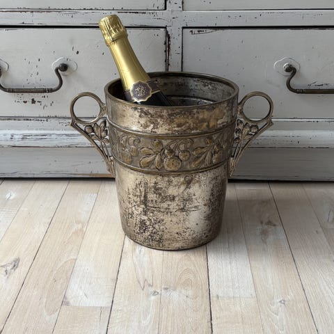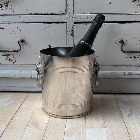 Jacquart champagnekøler i sølvfarvet metal med hank i begge sider. Spandens form er klassisk konisk, egnet til nedkøling og servering af champagne- og vinflasker. Indersiden er glat metal, og ydersiden har Jacquart-logo på fronten samt dekorative riller øverst. Velegnet til brug med isterninger til opbevaring af en eller flere flasker på bordet.