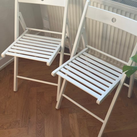 Stabil hvid klapstol med blå hynde