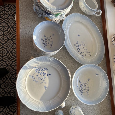 Sættet er fra 1960'erne og i fin stand. Der er ingen står i glasfadene. Bakken er teaktræ og beholderne er gennemsigtige, så indholdet er synligt. Sættet kan anvendes til servering eller opbevaring af f.eks. snacks, tilbehør eller småting på bord eller køkkenbord. Mål kan aflæses cirka ud fra tommestokken på billederne, hvor bakken er omkring 50 cm lang.