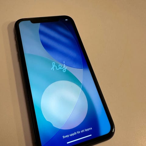 Apple iPhone 11 smartphone med 64 GB. På bagsiden ses en rund plade, der kan være til montering af magnetisk holder eller lignende tilbehør, men kan også fjernes. Der medfølger et sort cover, som passer til modellen.