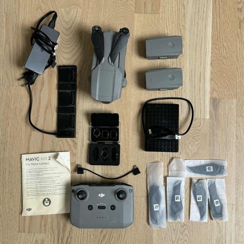 DJI Mavic Air 2 drone i grå farve. Foldbar quadcopter med fire propeller og integreret kamera på gimbal i fronten. Dronen egner sig til luftfoto og videooptagelser samt rekreativ flyvning. Leveres med oplader og opbevaringstaske som vist på billederne. Har desværre mistet intressen for det. Er også villig til at forhandle om prisen