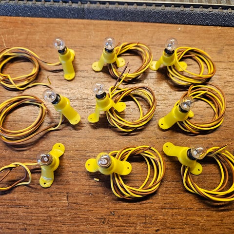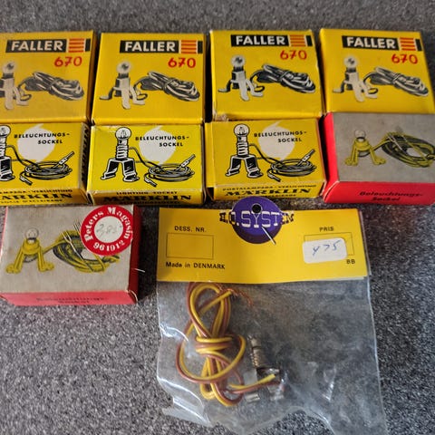 7 stk. Husbelysning til modelbane sælges samlet. Nogle af pærerne er malet for at retningsbestemt lyset. 3 stk. ekstra pærer medfølger. Alle lyser. Sender gerne. Se også mine andre annoncer med modeltog
