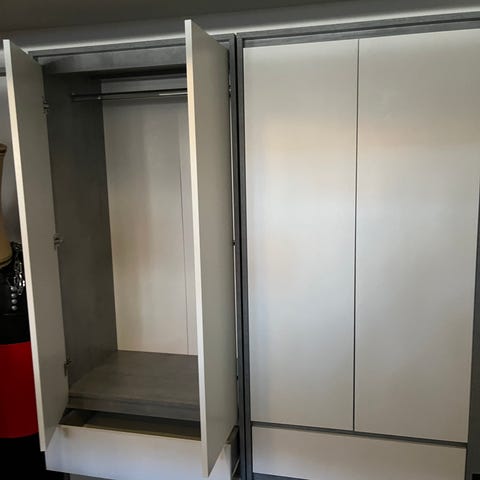 Gode og pæne skabe. De står på skuffer kassetter og måler sammenlagt 246 cm.