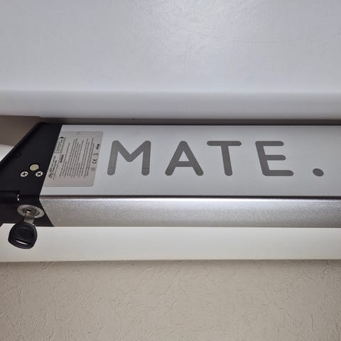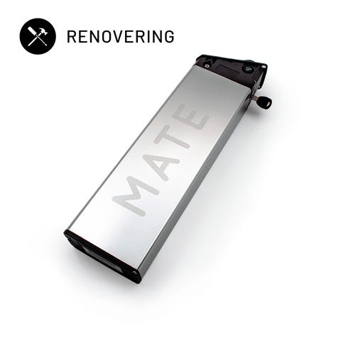MATE batteri til elcykel i aflang, rektangulær form. Batteriet er sølvfarvet med sort top og bund og har indbygget Li-ion battericelle ifølge mærkningen. Det er beregnet til montering i en MATE elcykel som udskiftnings- eller reservebatteri. Fysiske mål og kapacitet fremgår af etiketten på batteriet og kan bruges til at kontrollere kompatibilitet med den konkrete MATE model.