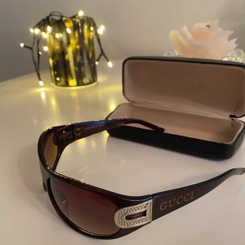 Gucci solbriller til kvinde i brun nuance med store, firkantede stel og mørke glas. Stellet har brede stænger med Gucci-logo i guld og karakteristiske striber i grøn og rød. Leveres med hårdt etui og pudseklud med Gucci-logo, som kan bruges til opbevaring og rengøring af brillerne.