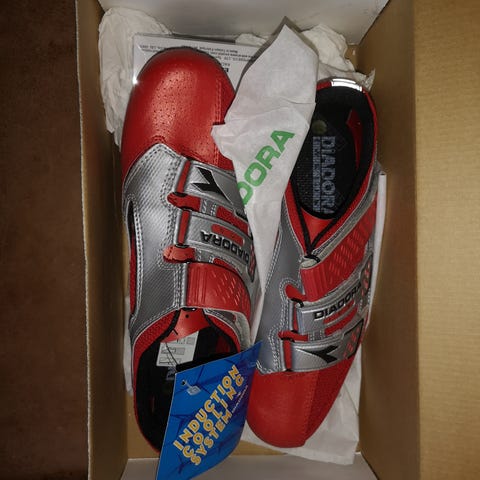 Diadora cykelsko i str. 38. Skoene er i farverne lilla, hvid og pink med sorte såler. De har lukning med to velcrostropper og én spændejustering for at give en fast pasform. Undersiden er forberedt til montering af klamper til klikpedaler. Egnet som cykelsko til landevej eller spinning afhængigt af klampesystemet, der monteres.