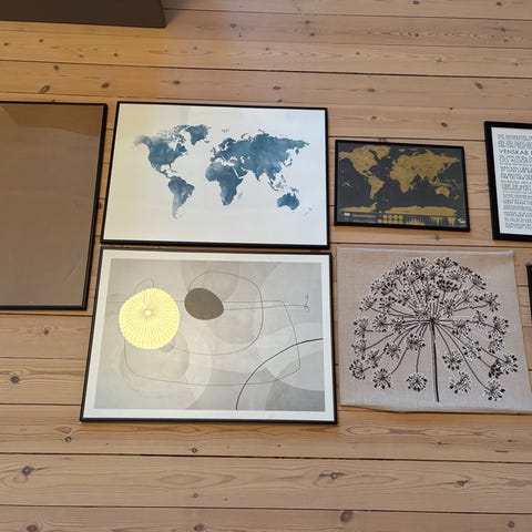 Det indrammede broderi (ældre såkaldt navneklud i sølvbemalet træramme), der skimtes på det øverste billede, præsenteres i sin egen annonce.