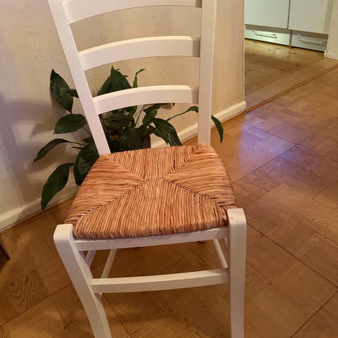 Spisebordsstol med hvidmalet træstel og naturfarvet fletsæde. Klassisk stol med høj ryg og tværgående tremmer under sædet, egnet til brug ved spisebord eller som ekstra siddeplads i køkken eller stue.