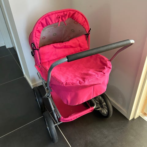 Dukkevogn med regnslag, insektnet, dyne og pude.
