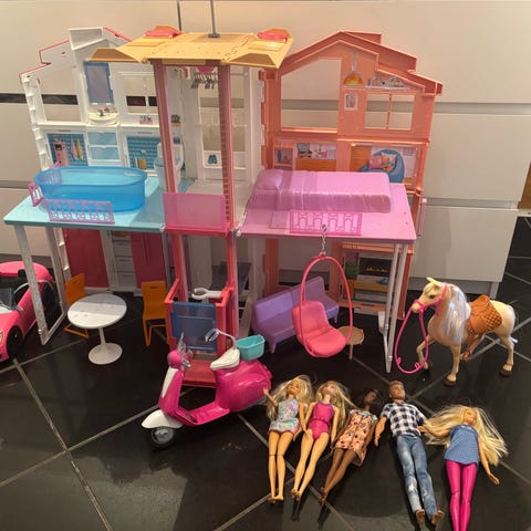 Barbie dukkehus med flere etager og indrettede rum som køkken, stue og soveværelser. Sættet omfatter flere Barbie-dukker i forskellige kjoler samt flere heste også lysende hest med lyd.