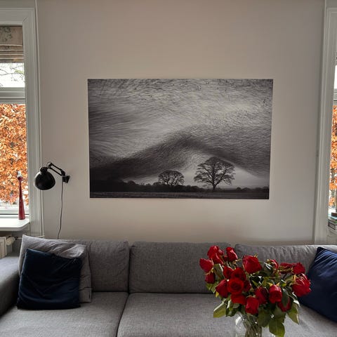 Billedet er indrammet i en pænt smal metalramme med glas.