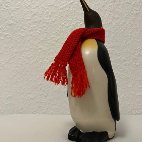 Figuren forestiller en stående pingvin fra Den Danske Bank lavet hos Knapstrup. Den har et strikket rødt halstørklæde om halsen og nøgle medfølger. I bunden er der en metalplade med nøglehul til at åbne sparebøssen. Velegnet som dekorativ figur og til opbevaring af mønter. Uden afslag.
