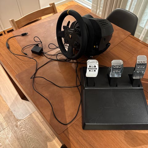 Thrustmaster Ferrari Racing Wheel Red Legend Edition rat og pedaler til gaming. Rattet er udformet med Ferrari-inspireret design i rød og sort og leveres sammen med pedal sæt. Sættet er beregnet til bilspil og racingsimulationer, hvor rat og pedaler giver mere præcis styring end en traditionel controller.