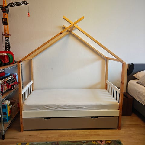Hjemmebygget husseng med god plads til opbevaring. Mulighed for at sætte gardin op, for at skabe hygge i sengen.