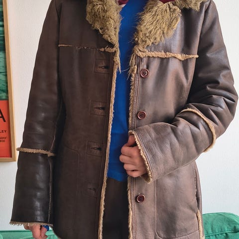Dear Dharma vinterjakke til kvinder i str. 38. Jakken er sort og fremstillet i læder med blød, teddy-lignende inderside. Modellen har gennemgående lynlås foran, to lynlåslommer i siderne samt lynlåse ved ærmeafslutningerne. Kraven er høj med stropper og metaløjer, der kan spændes. Velegnet som varm vinterjakke i koldt vejr.