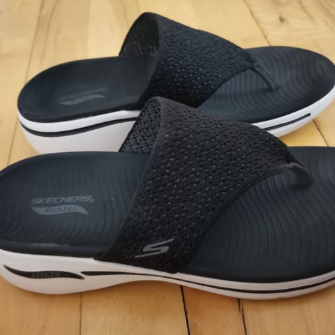 Nye Skechers GO WALK Flex sandal str. 37 har en tekstiloverdel med justerbarrem, en kontureret Goga Mat indersål, let ULTRA GO polstring, fleksibel trækktafy-ydersål og kan maskinvaskes.