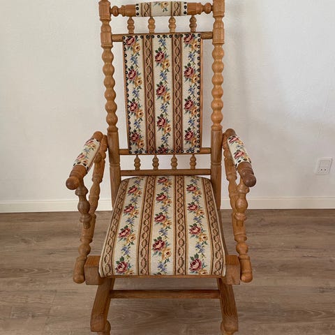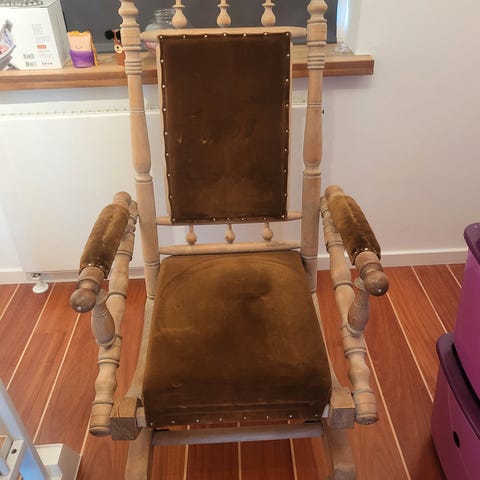 Gammeldags hyggelig rokkestol/gyngestol med smukt grøn-gul betræk i velour på sæde og ryg og i mørk blank træ. Fuld funktionsdygtig og meget velholdt. H 108 x B 55 X D 74 cm.