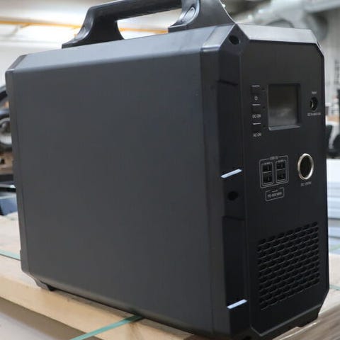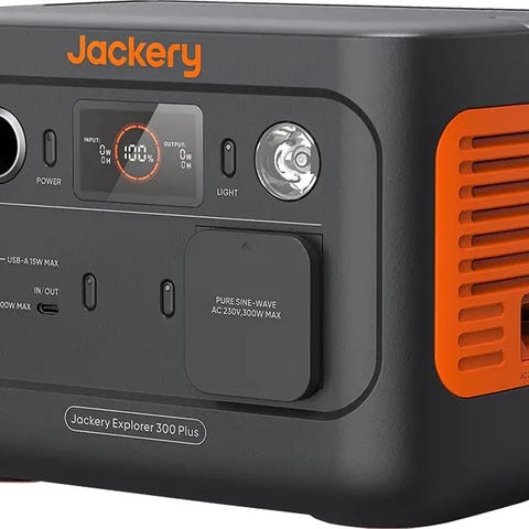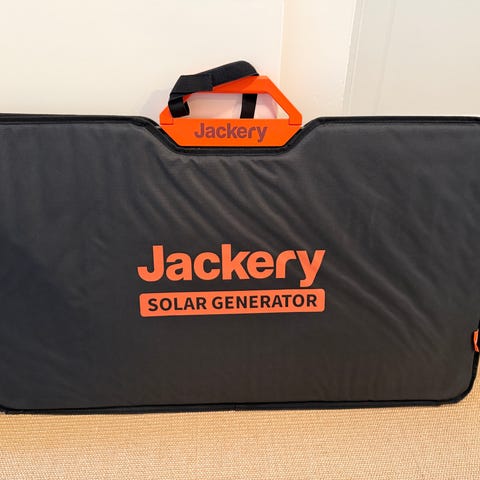 Jackery Explorer 500 power station med tilhørende solpanel i sort/orange med 100w. Enheden har bærehåndtag og indbygget display, der viser batteristatus og øvrige driftsinformationer. Frontpanelet omfatter flere udgange til strømforsyning af kompatible enheder. Solarsaga 100 kan anvendes til opladning af power stationen ved hjælp af solenergi.